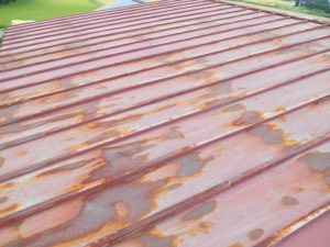 屋根全体の塗膜が劣化し、広範囲に錆びが見られるものの、まだ致命的な穴あきには至っていない状態です。