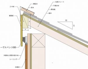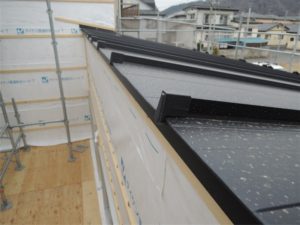 棟部分を透湿ルーフィングなどで覆い、破風板に垂らすことで防水性を高める。