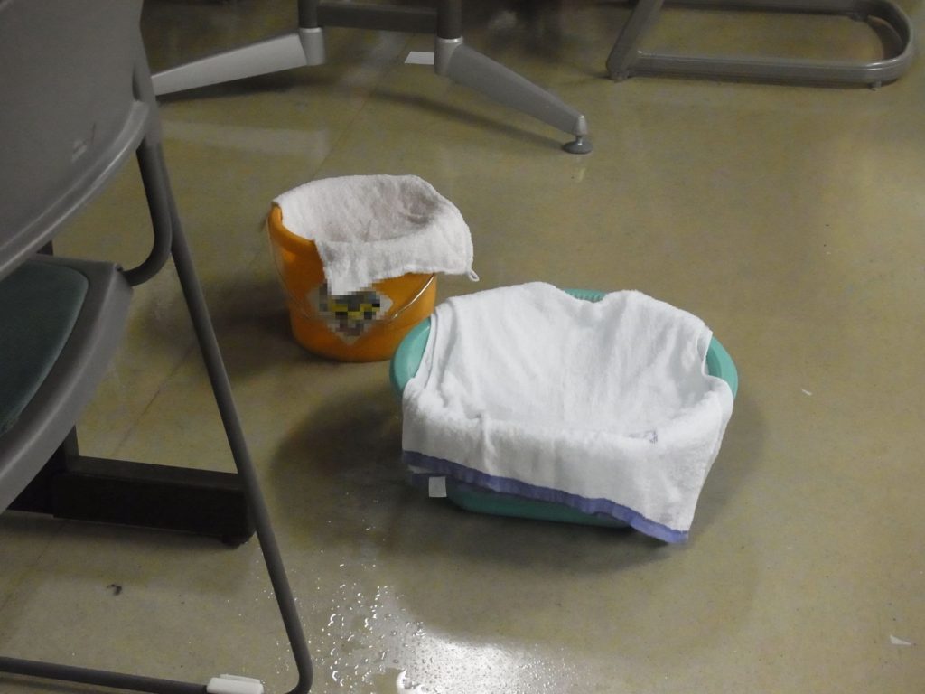 - その中央に、雑巾を入れたバケツを置きます。バケツの底に雑巾を敷いておくことで、水滴が床に跳ね返るのを効果的に防げます。