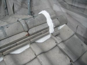 スレート屋根のひび割れなどを、コーキング材で埋める方法です。