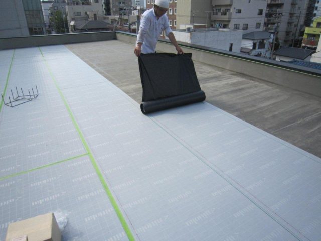 アスファルト防水アスファルトを含浸させたルーフィング類を複数枚重ねて防水層を形成。熱工法、トーチ工法、常温工法などがある。13年~20年程度防水信頼性が非常に高い。耐久性に優れる。押えコンクリートで保護することも可能。重量があるため建物への負荷が大きい。施工時に臭いや煙が発生する場合がある(熱工法、トーチ工法)。費用が高め。下地の動きに弱い。費用は工法により大きく異なる
