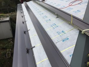 スレート屋根には、屋根の上に棟板金と呼ばれる金属板が設置されています。