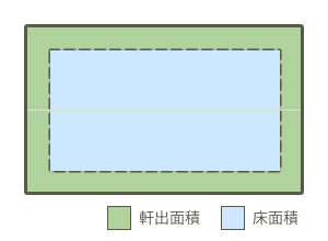床面積は図の水色の部分、軒出面積は緑色の部分の面積です。